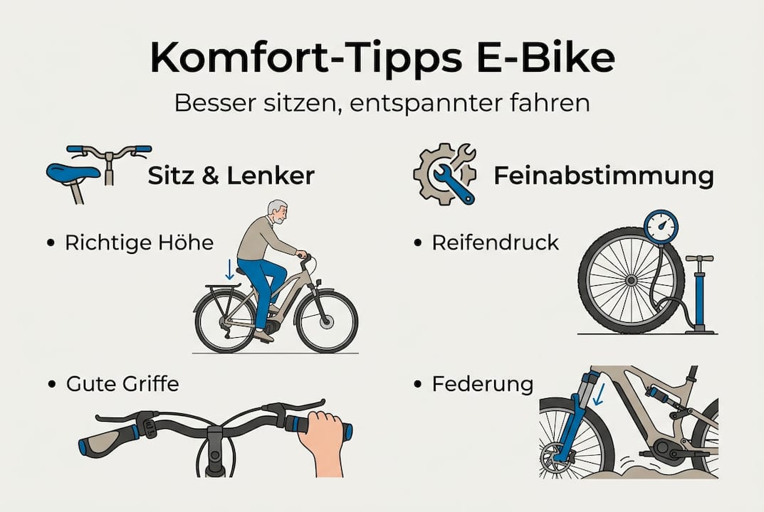 Nach einer langen E-Bike-Tour melden sich Rücken, Handgelenke oder der Po mit unangenehmen Schmerzen. Kennst du das? Viele Senioren und Familien erleben genau das, obwohl sie ein hochwertiges E-Bike fahren. Der Grund ist oft kein schlechtes Fahrrad, sondern eine falsch eingestellte Sitzposition, unpassende Griffe oder ein zu hoher Reifendruck. Die gute Nachricht: Mit gezielten Anpassungen und dem richtigen Zubehör lässt sich der Fahrkomfort spürbar steigern. Dieser Ratgeber zeigt dir Schritt für Schritt, wie du dein E-Bike optimal auf deine Bedürfnisse abstimmst, ob du über 60 bist oder mit der Familie unterwegs bist.
